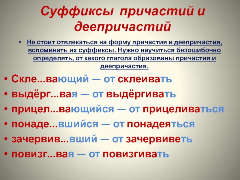 вспоминать их суффиксы. Нужно научиться безошибочно определять, от какого глагола образованы причастия и деепричастия.