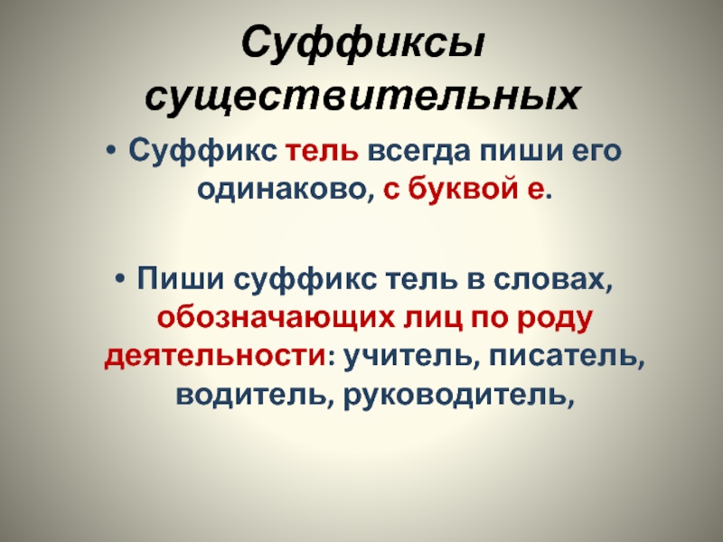 тель в словах, обозначающих лиц по роду деятельности: учитель, писатель, водитель, руководитель,
