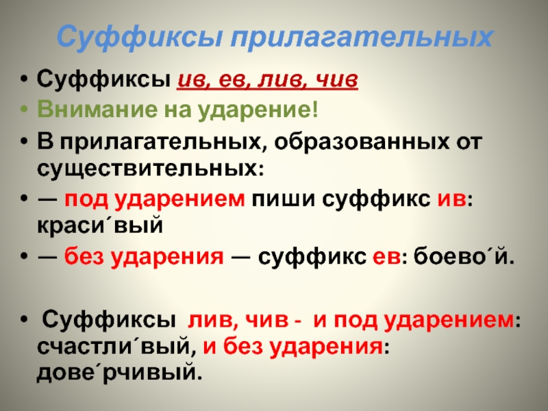 Суффиксы лив, чив - и под ударением: счастли´вый, и без ударения: дове´рчивый.