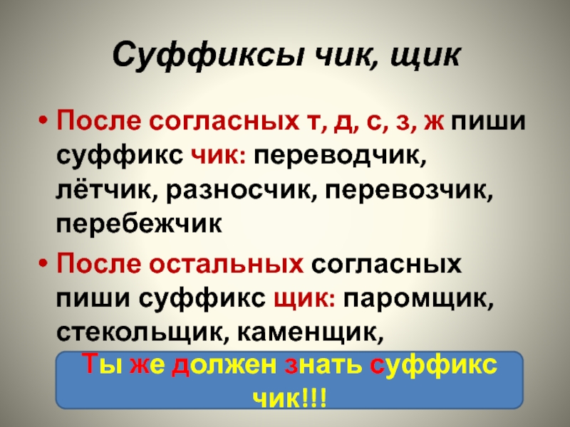 После остальных согласных пиши суффикс щик: паромщик, стекольщик, каменщик, фонарщик
