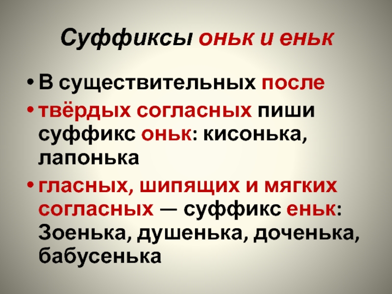 гласных, шипящих и мягких согласных — суффикс еньк: Зоенька, душенька, доченька, бабусенька