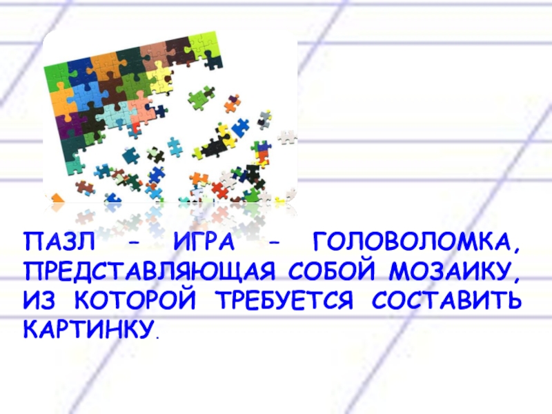 Слайд 1 ПАЗЛ – ИГРА – ГОЛОВОЛОМКА, ПРЕДСТАВЛЯЮЩАЯ СОБОЙ МОЗАИКУ, ИЗ КОТОРОЙ ТРЕБУЕТСЯ