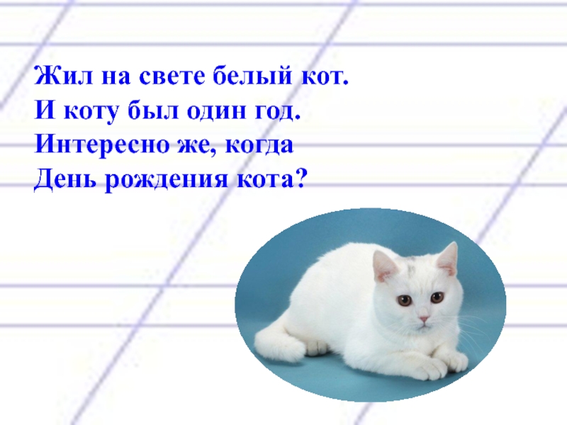 Слайд 5Жил на свете белый кот. И коту был один год. Интересно же, когда День
