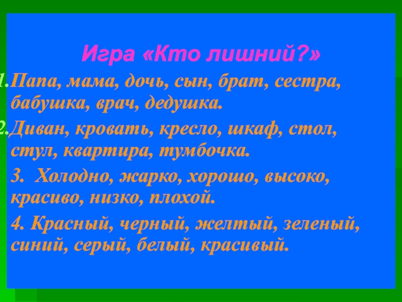 Игра «Кто лишний?»Папа, мама, дочь, сын, брат, сестра, бабушка, врач, дедушка.Диван, кровать, кресло, шкаф, стол, стул, квартира,