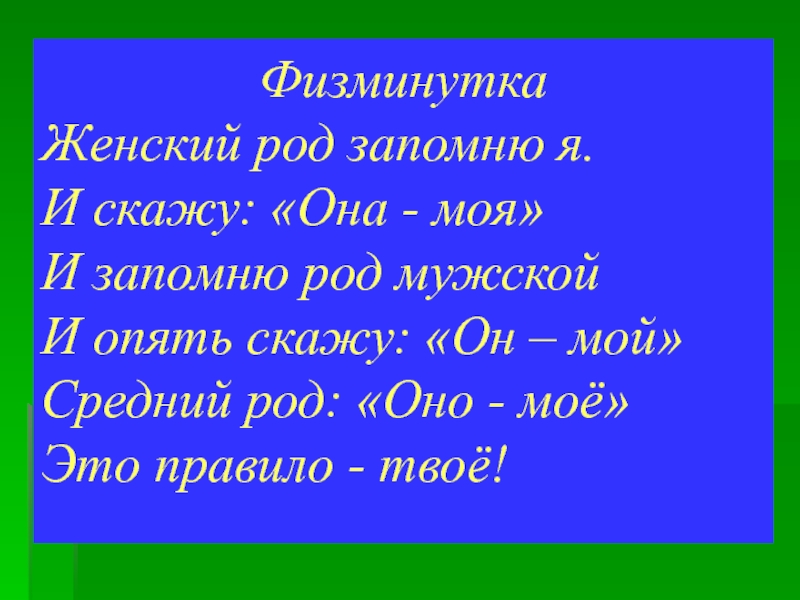 ФизминуткаЖенский род запомню я. И скажу: «Она - моя» И запомню род мужской И опять скажу: «Он