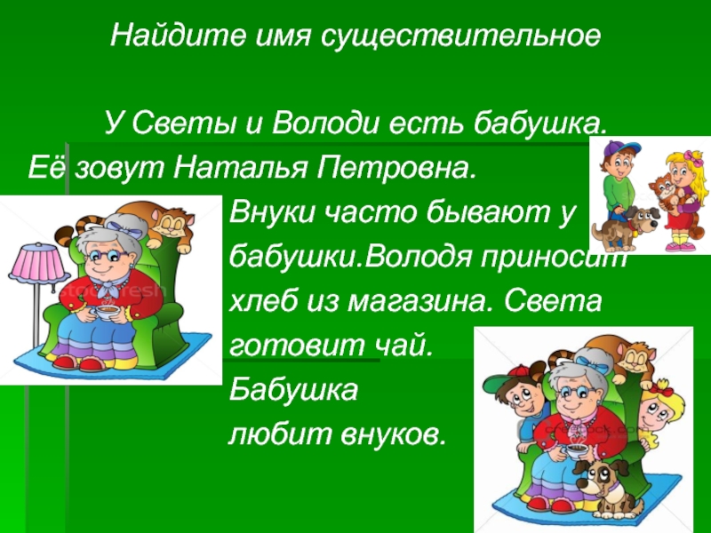 Найдите имя существительноеУ Светы и Володи есть бабушка. Её зовут Наталья Петровна.