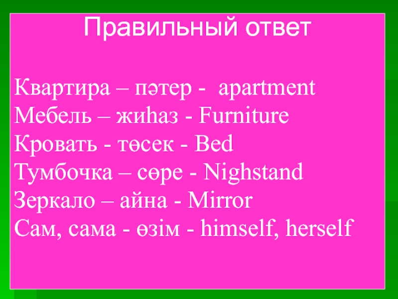 Правильный ответКвартира – пәтер - apartmentМебель – жиһаз - FurnitureКровать - төсек - BedТумбочка – сөре -