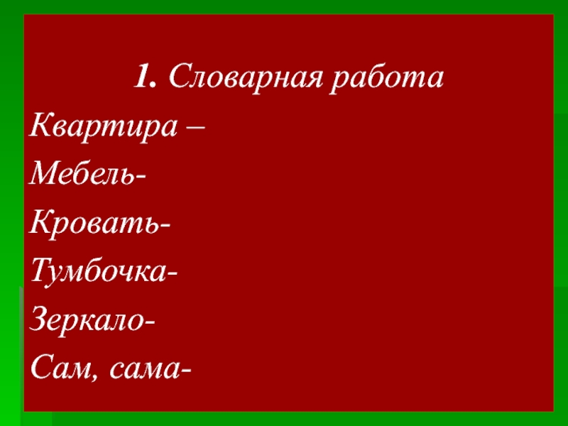 1. Словарная работа Квартира –Мебель-Кровать-Тумбочка-Зеркало-Сам, сама-