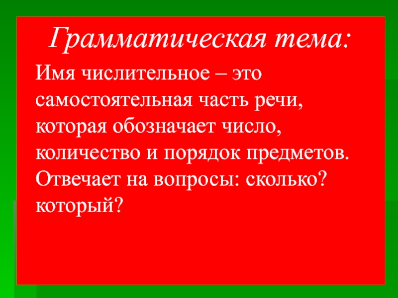Грамматическая тема:  Имя числительное – это самостоятельная часть речи, которая обозначает число, количество и порядок предметов.