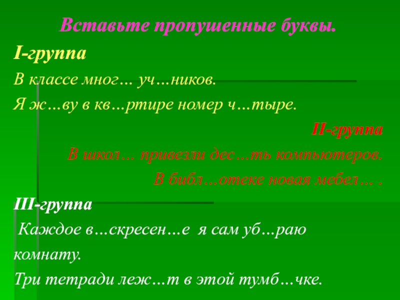 Вставьте пропушенные буквы.I-группаВ классе мног… уч…ников.Я ж…ву в кв…ртире номер ч…тыре.II-группаВ школ… привезли дес…ть компьютеров.В библ…отеке новая