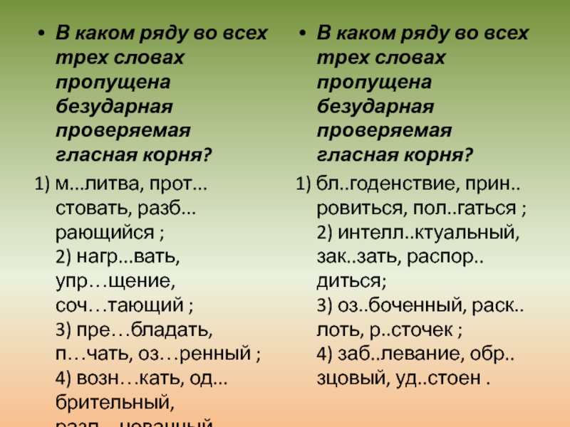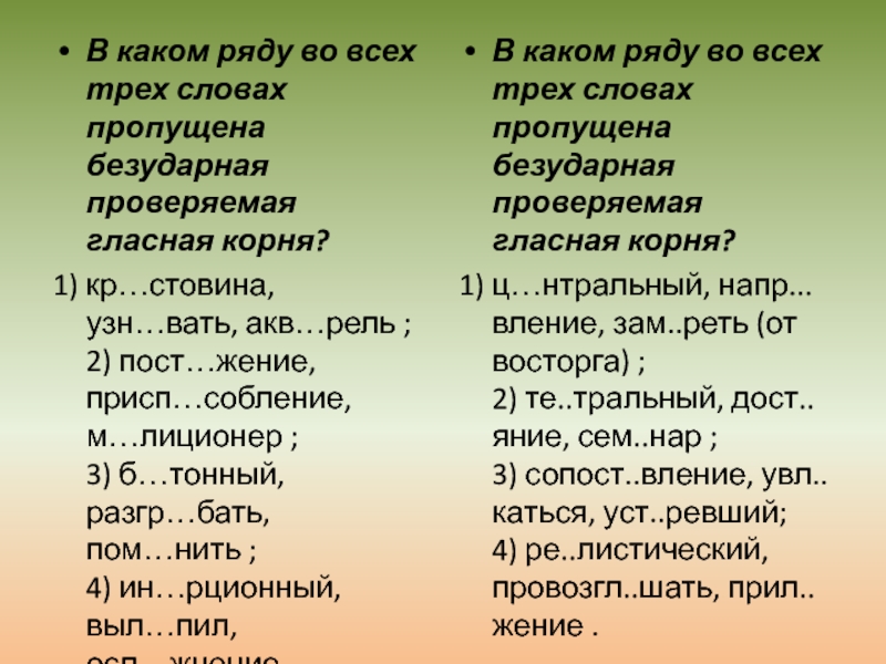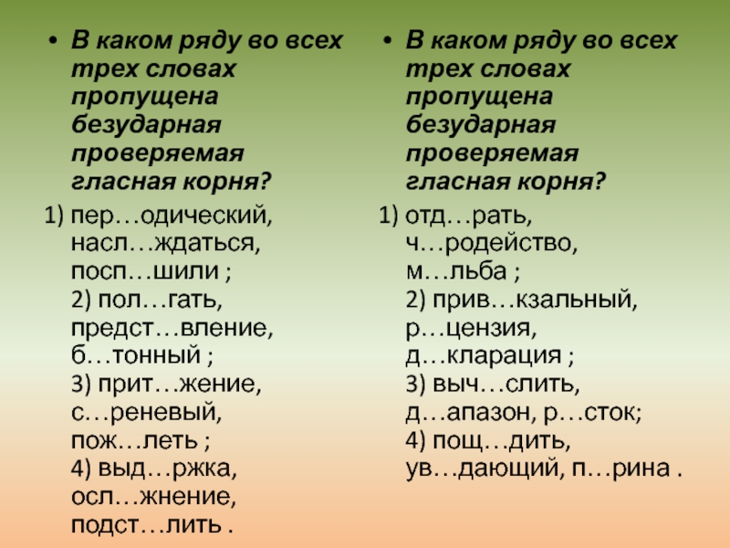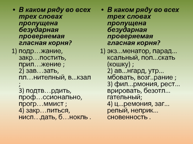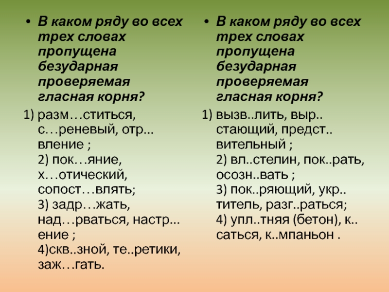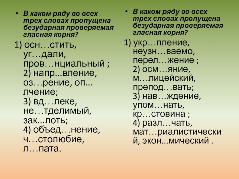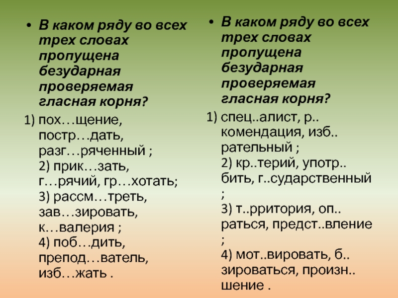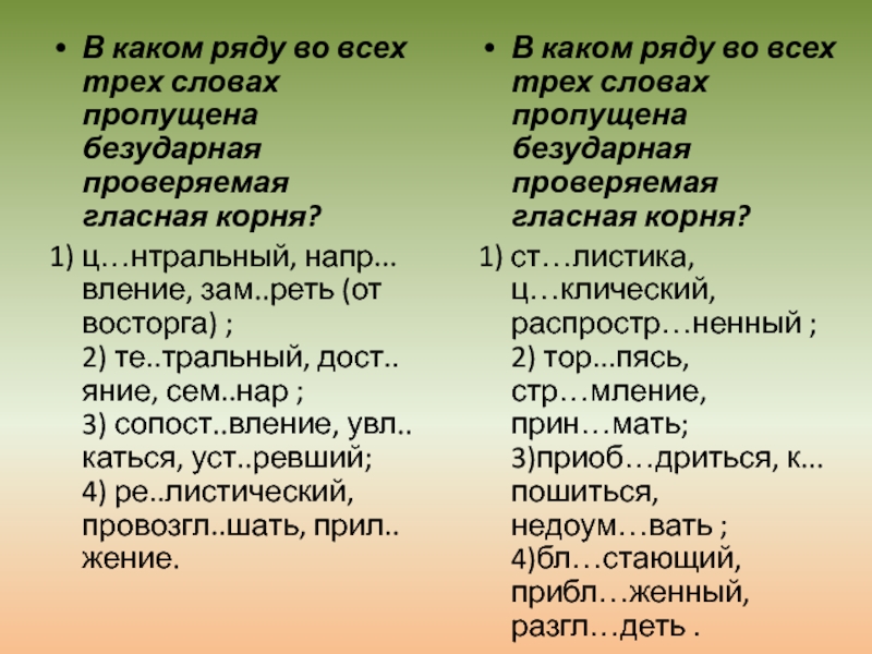 В каком ряду во всех трех словах пропущена безударная проверяемая гласная корня?