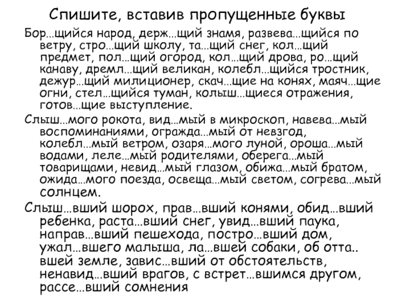 школу, та…щий снег, кол…щий предмет, пол…щий огород, кол…щий дрова, ро…щий канаву, дремл…щий великан, колебл…щийся тростник, дежур…щий милиционер, скач…щие на конях, маяч…щие огни, стел…щийся туман, колыш…щиеся отражения, готов…щие выступление.