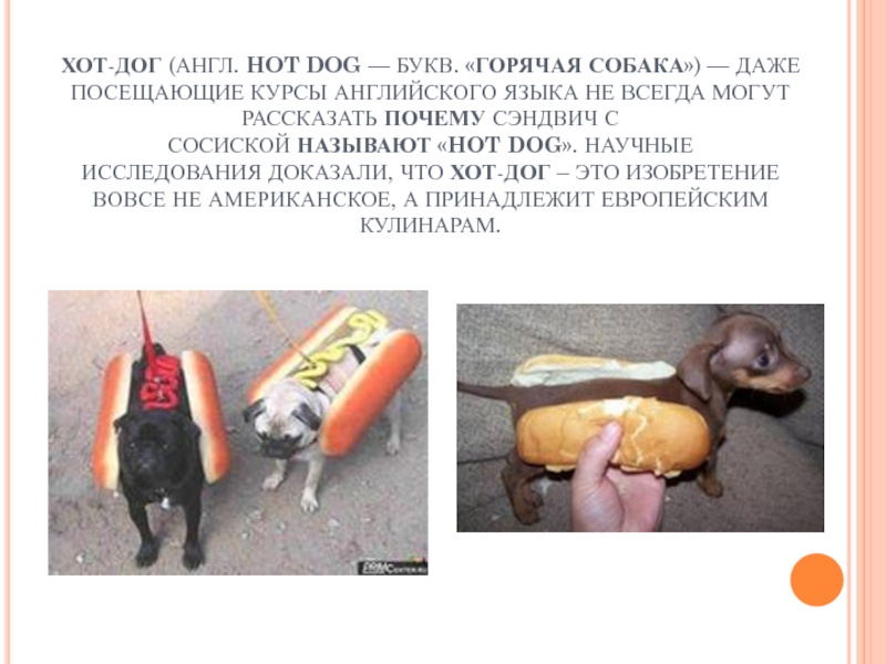 Слайд 3ХОТ-ДОГ (АНГЛ. HOT DOG — БУКВ. «ГОРЯЧАЯ СОБАКА») — ДАЖЕ ПОСЕЩАЮЩИЕ КУРСЫ АНГЛИЙСКОГО ЯЗЫКА НЕ ВСЕГДА