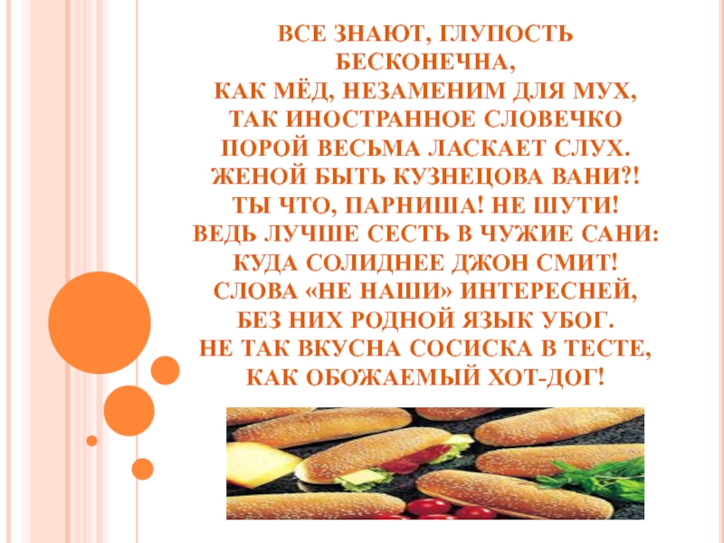 ЛАСКАЕТ СЛУХ. ЖЕНОЙ БЫТЬ КУЗНЕЦОВА ВАНИ?! ТЫ ЧТО, ПАРНИША! НЕ ШУТИ! ВЕДЬ ЛУЧШЕ СЕСТЬ В ЧУЖИЕ САНИ: КУДА СОЛИДНЕЕ ДЖОН СМИТ! СЛОВА «НЕ НАШИ» ИНТЕРЕСНЕЙ, БЕЗ НИХ РОДНОЙ ЯЗЫК УБОГ. НЕ ТАК ВКУСНА СОСИСКА В ТЕСТЕ, КАК ОБОЖАЕМЫЙ ХОТ-ДОГ!