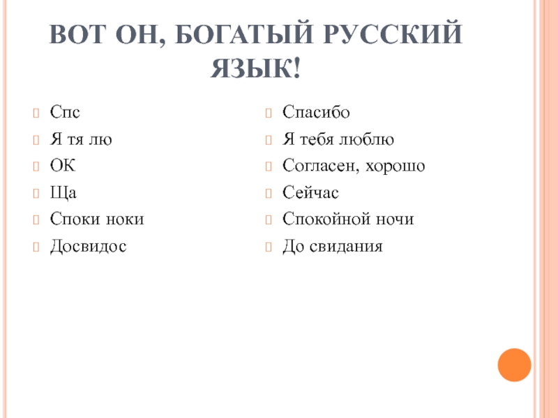 ВОТ ОН, БОГАТЫЙ РУССКИЙ ЯЗЫК!СпсЯ тя люОКЩа Споки нокиДосвидосСпасибоЯ тебя люблюСогласен, хорошоСейчас Спокойной ночиДо свидания