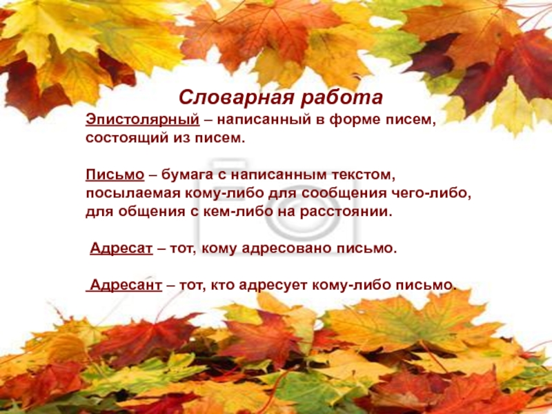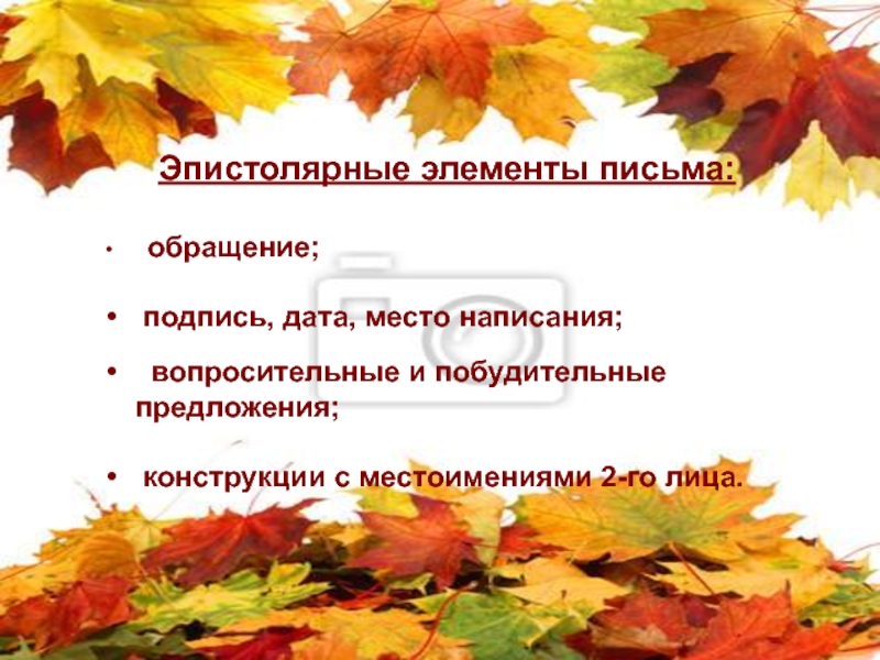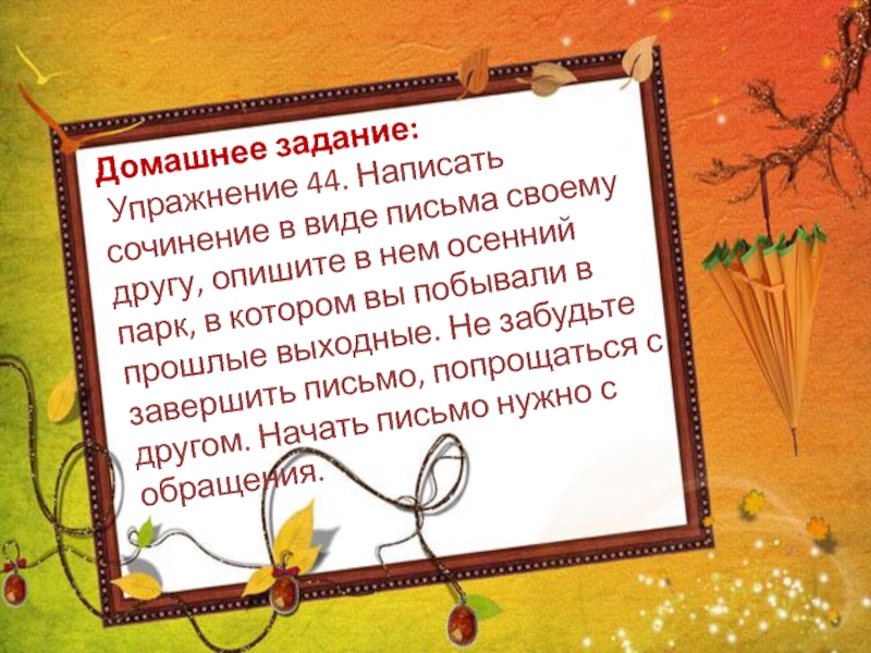 опишите в нем осенний парк, в котором вы побывали в прошлые выходные. Не забудьте завершить письмо, попрощаться с другом. Начать письмо нужно с обращения.