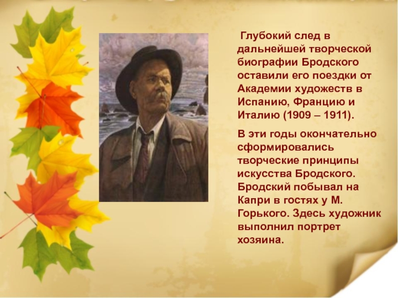В эти годы окончательно сформировались творческие принципы искусства Бродского. Бродский побывал на Капри в гостях у М.Горького. Здесь художник выполнил портрет хозяина.