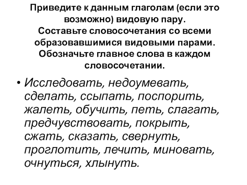 Исследовать, недоумевать, сделать, ссыпать, поспорить, жалеть, обучить, петь, слагать, предчувствовать, покрыть, сжать, сказать, свернуть, проглотить, лечить, миновать, очнуться, хлынуть.