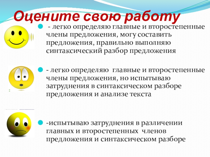 - легко определяю главные и второстепенные члены предложения, но испытываю затруднения в синтаксическом разборе предложения и анализе текста