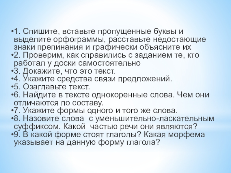 Слайд 151. Спишите, вставьте пропущенные буквы и выделите орфограммы, расставьте недостающие знаки