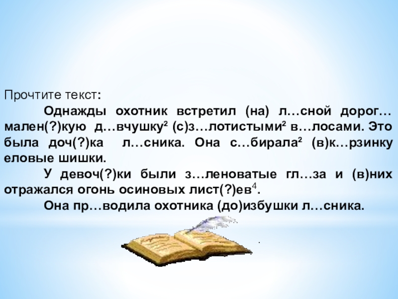 Однажды охотник встретил (на) л…сной дорог… мален(?)кую д…вчушку² (с)з…лотистыми² в…лосами.