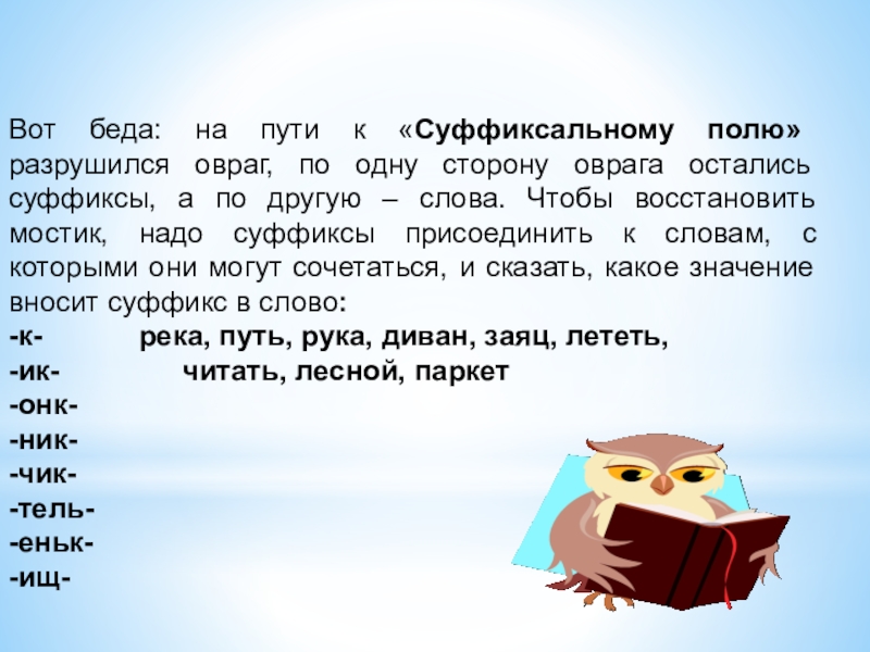 сторону оврага остались суффиксы, а по другую – слова. Чтобы восстановить мостик, надо суффиксы присоединить к словам, с которыми они могут сочетаться, и сказать, какое значение вносит суффикс в слово: