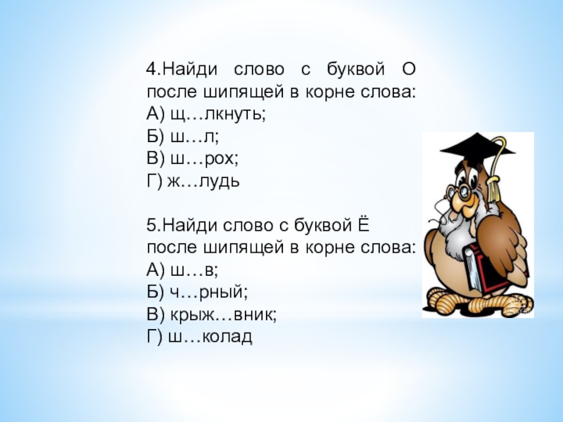 Слайд 174.Найди слово с буквой О после шипящей в корне слова: