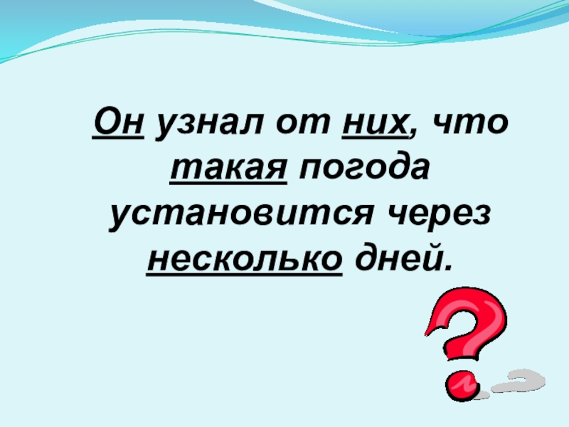 Слайд 4Он узнал от них, что такая погода установится через несколько дней.