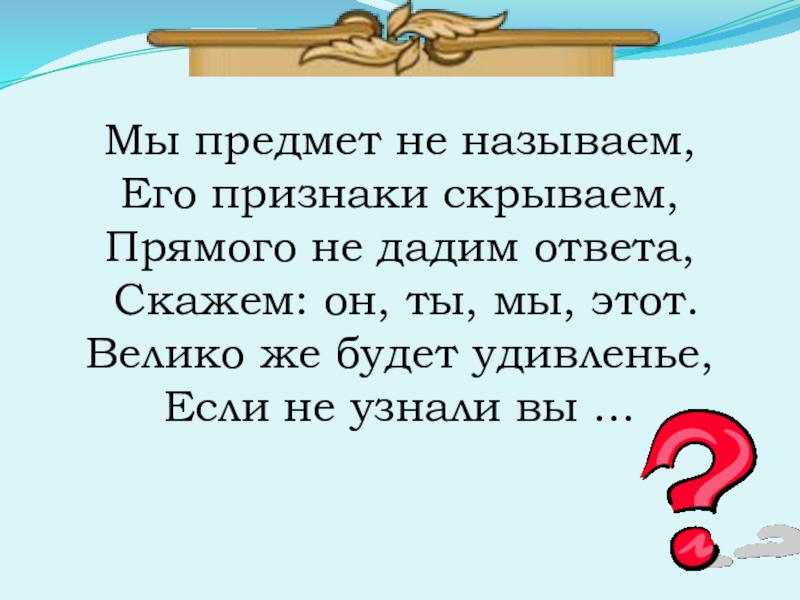 Мы предмет не называем, Его признаки скрываем,Прямого не дадим ответа, Скажем: он, ты, мы, этот.Велико же будет