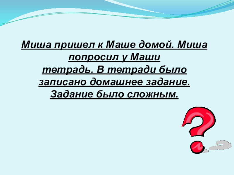 Миша пришел к Маше домой. Миша попросил у Маши тетрадь. В тетради было записано домашнее задание. Задание