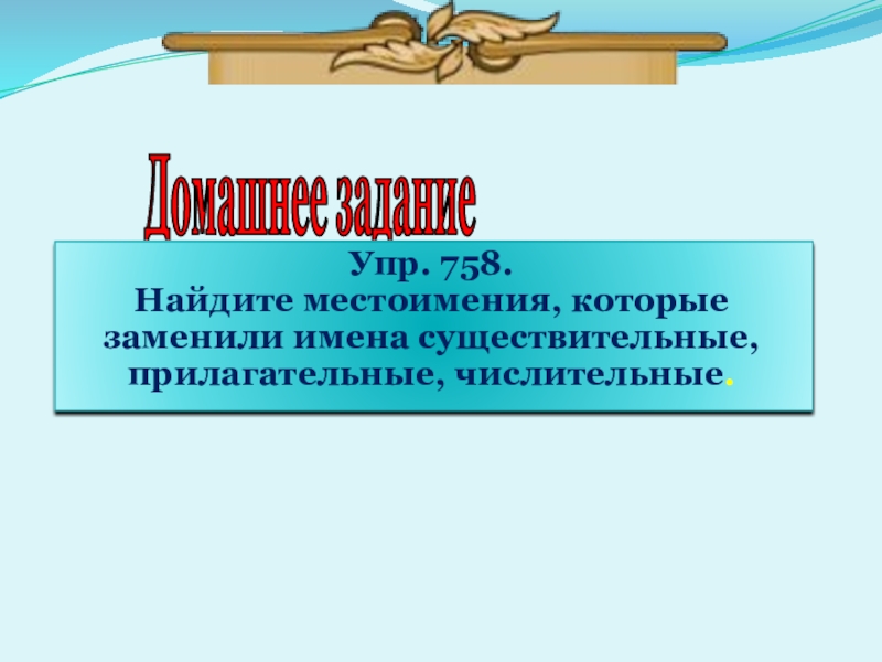 Домашнее задание Упр. 758. Найдите местоимения, которые заменили имена существительные, прилагательные, числительные.