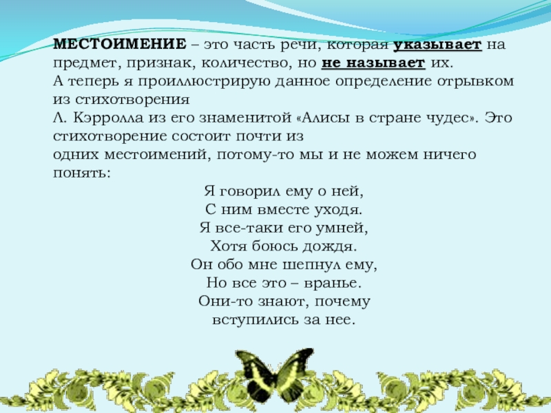 МЕСТОИМЕНИЕ – это часть речи, которая указывает на предмет, признак, количество, но не называет их.А теперь я
