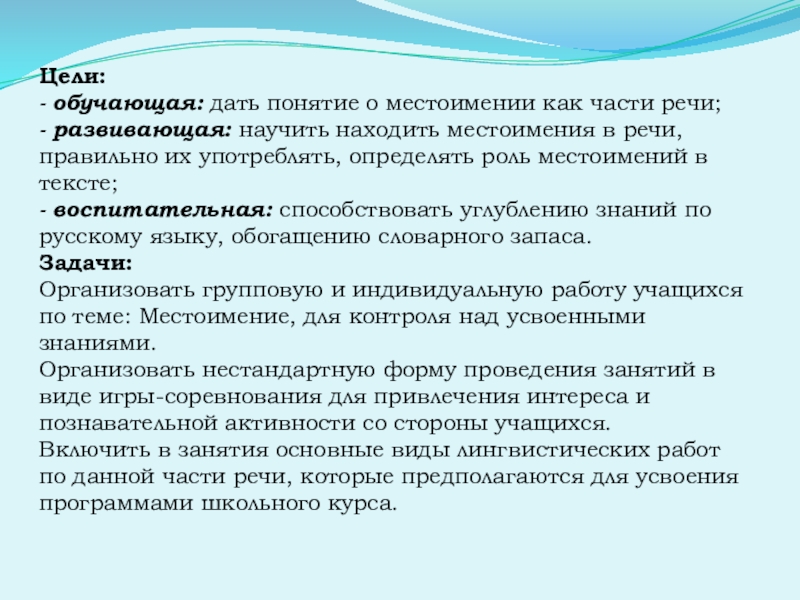 Цели: - обучающая: дать понятие о местоимении как части речи;- развивающая: научить находить местоимения в речи, правильно их употреблять, определять роль местоимений в тексте;- воспитательная: способствовать углублению знаний по русскому языку, обогащению словарного запаса. Задачи: Организовать