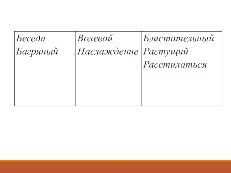 Слайд 1Блистательный, беседа, волевой, растущий, наслаждение, багряный, расстилается.