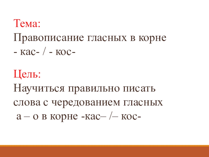 Тема: Правописание гласных в корне     - кас- / - кос-Цель:Научиться правильно писать слова