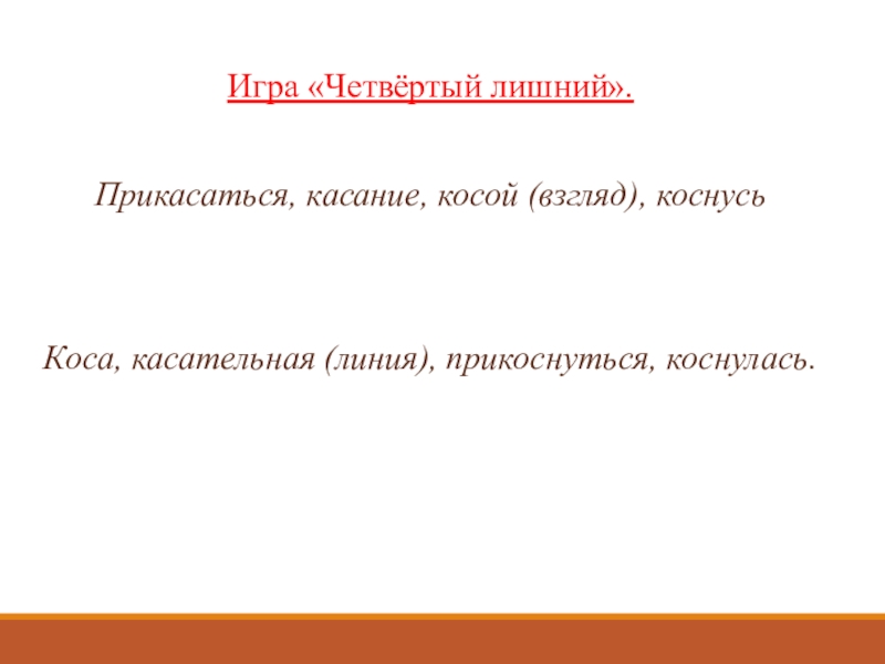 Игра «Четвёртый лишний». Прикасаться, касание, косой (взгляд), коснусьКоса, касательная (линия), прикоснуться, коснулась.