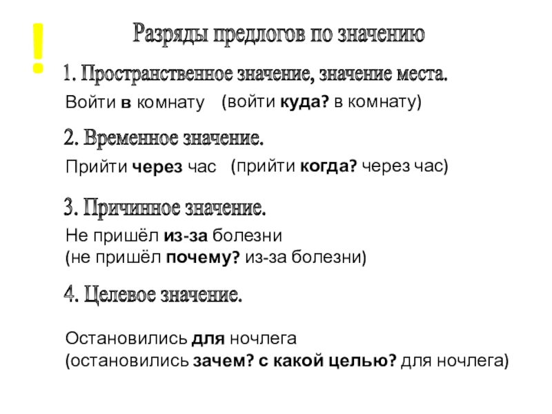 По значению делятся на предлоги с пространственным, временным, причинным и целевым значением.