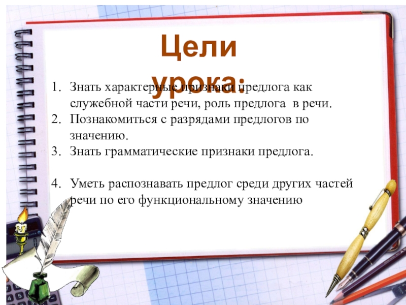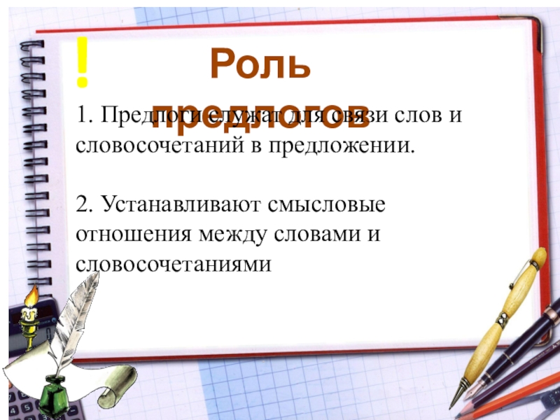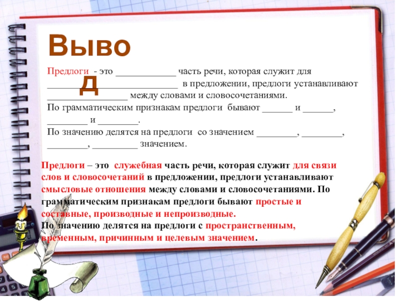 Предлоги – это служебная часть речи, которая служит для связи слов и словосочетаний в предложении, предлоги устанавливают смысловые отношения между словами и словосочетаниями. По грамматическим признакам предлоги бывают простые и составные, производные и непроизводные.