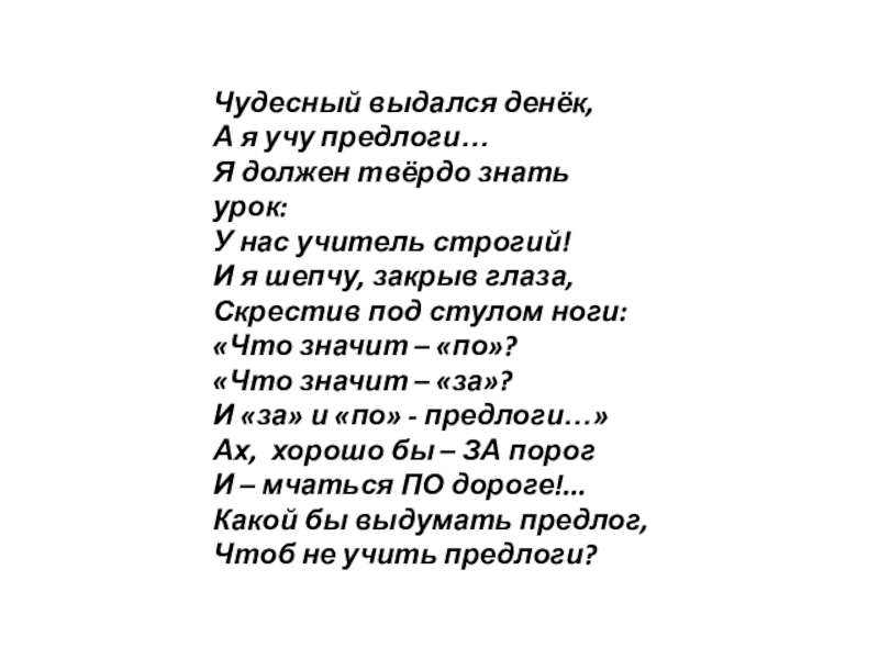 -Во-первых, не все предлоги маленькие. Например: в течение, в продолжение, несмотря на – это тоже предлоги, а вот какие длинные, а во-вторых, ты бы, Кузя лучше под столом пыль вытер, чем всякую ерунду говорить. –Кузя принял обиженный вид, и бормоча себе под нос: