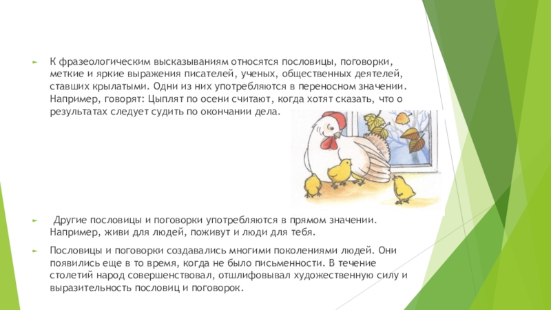 ученых, общественных деятелей, ставших крылатыми. Одни из них употребляются в переносном значении. Например, говорят: Цыплят по осени считают, когда хотят сказать, что о результатах следует судить по окончании дела.