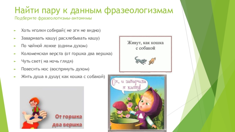 Слайд 9Найти пару к данным фразеологизмам
