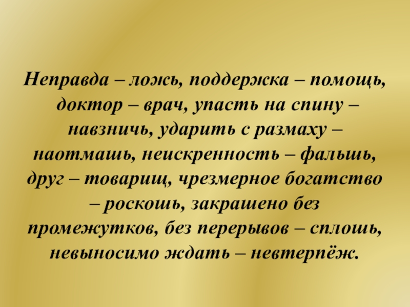 Неправда – ложь, поддержка – помощь, доктор – врач, упасть на спину – навзничь, ударить с размаху