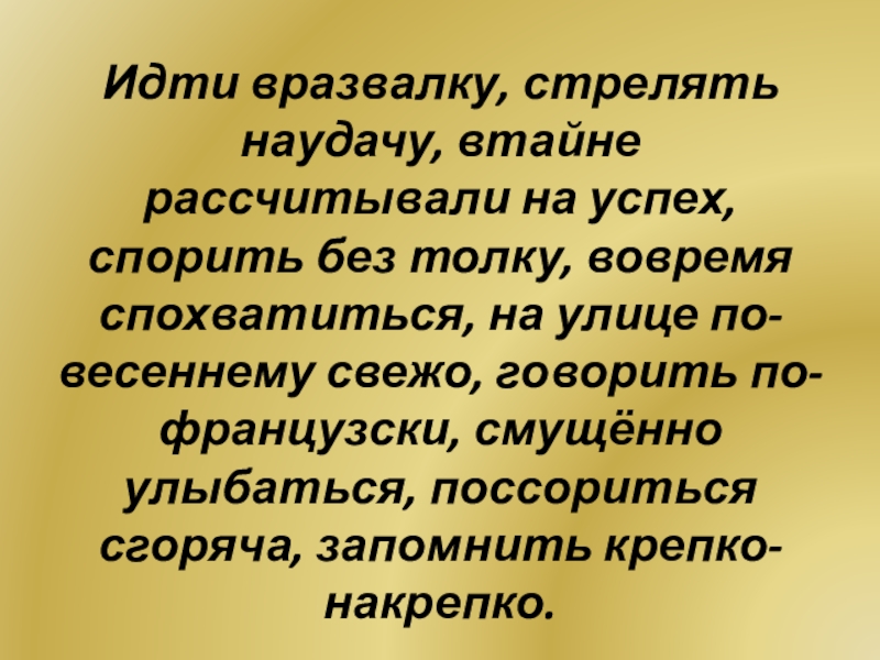 Слайд 2 Идти вразвалку, стрелять наудачу, втайне рассчитывали на успех, спорить без толку,