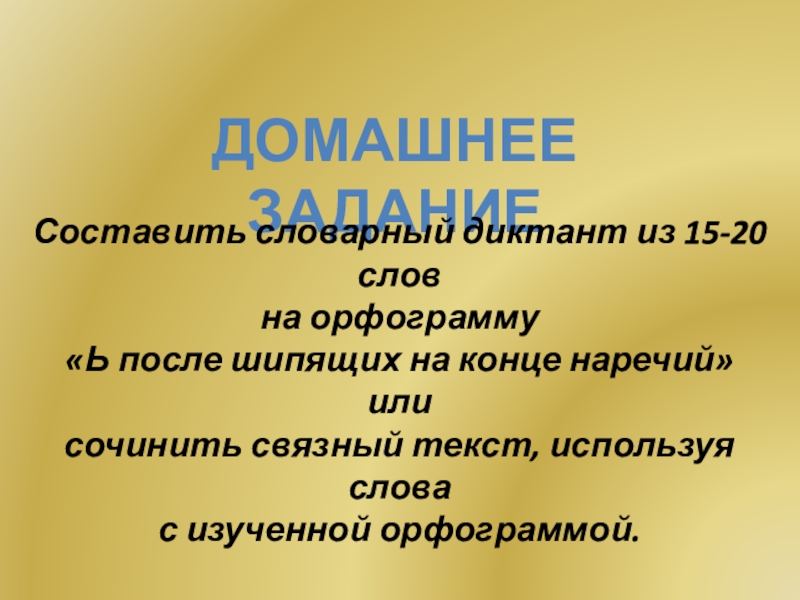 Домашнее заданиеСоставить словарный диктант из 15-20 слов на орфограмму«Ь после шипящих на конце наречий»илисочинить связный текст, используя