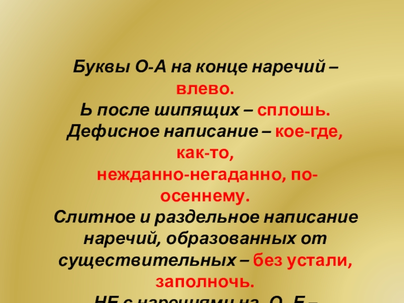 Буквы О-А на конце наречий – влево.Ь после шипящих – сплошь.Дефисное написание – кое-где, как-то, нежданно-негаданно, по-осеннему.Слитное