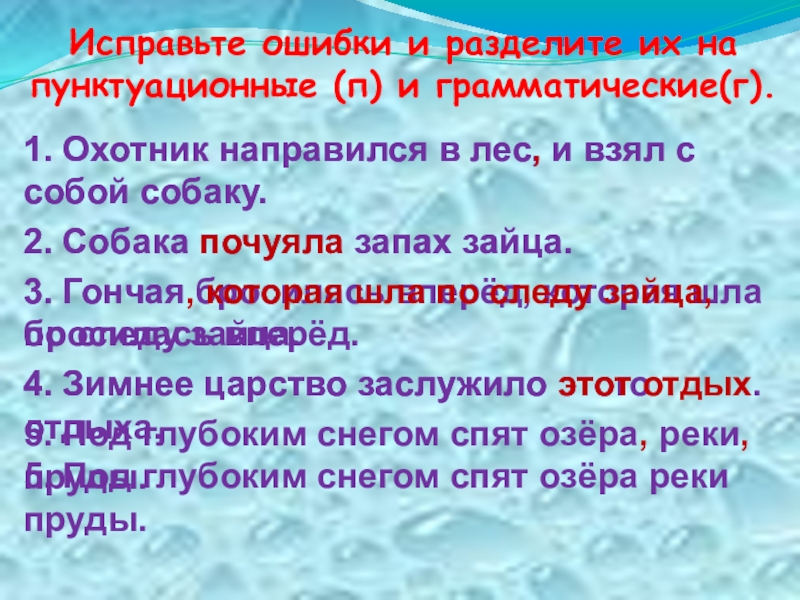 Исправьте ошибки и разделите их на пунктуационные (п) и грамматические(г).