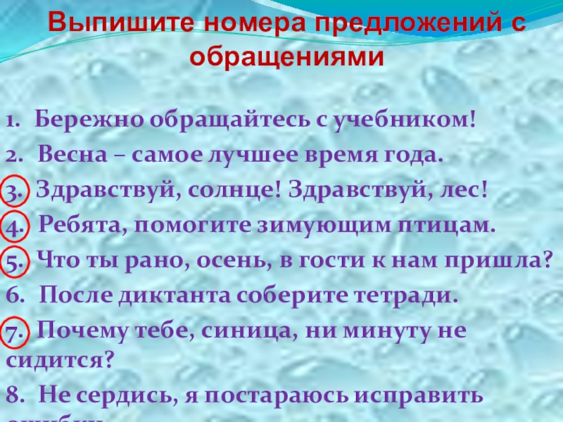 Выпишите номера предложений с обращениями