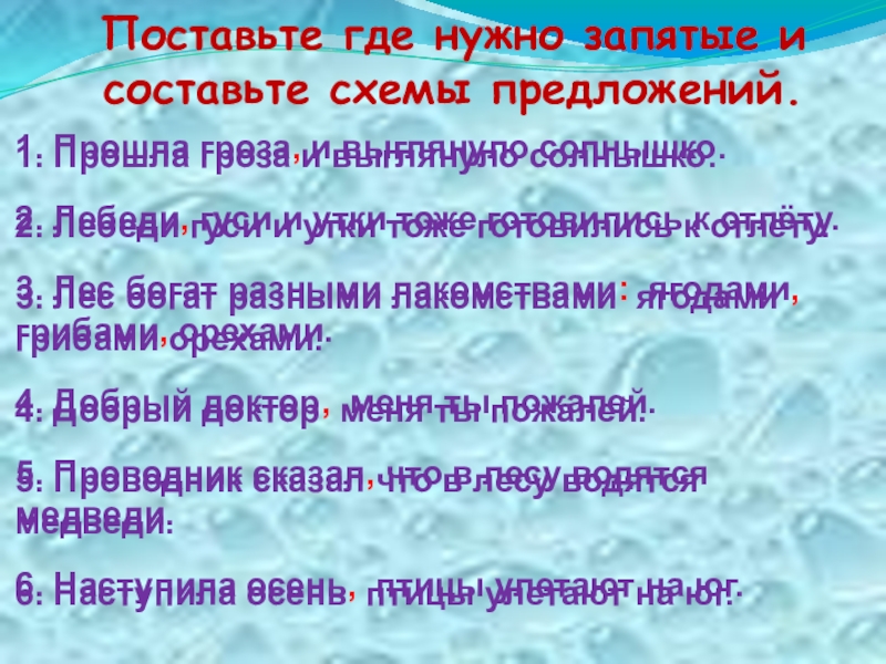 Поставьте где нужно запятые и составьте схемы предложений.