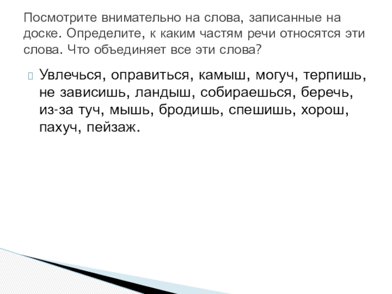 Посмотрите внимательно на слова, записанные на доске. Определите, к каким частям речи относятся эти слова. Что объединяет все эти слова?