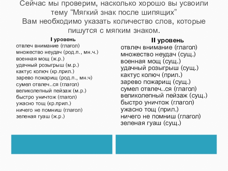 Сейчас мы проверим, насколько хорошо вы усвоили тему “Мягкий знак после шипящих”